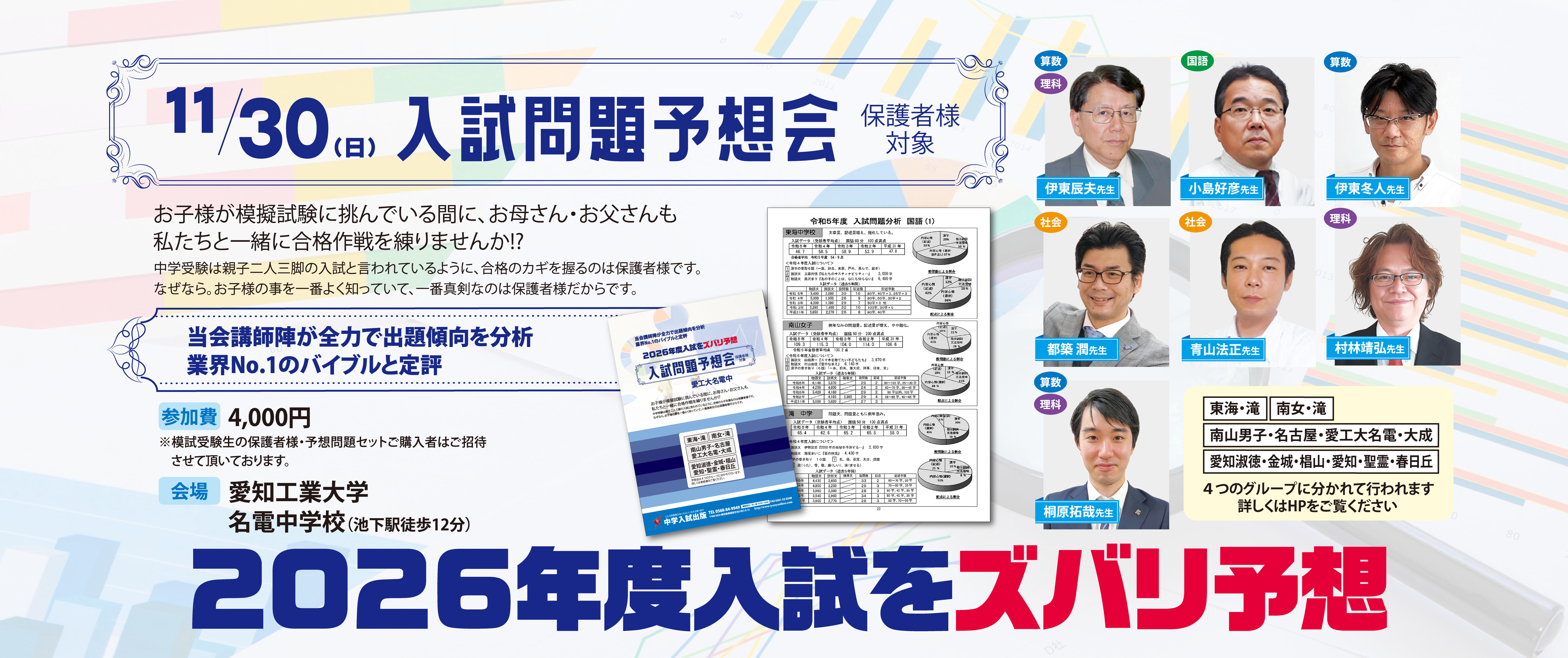 過去3年間の入試デ-タ-(配点・平均点・配点・合格最低点など)各ページに学校ごとの対策問題情報も掲載しております 大阪 高槻中学校 四天王寺中学校 大阪星光学院中学校 京都 同志社中学校 洛南高校附属中学校 洛星中学校 奈良 東大寺学園中学校 西大和学園中学校 兵庫 六甲中学校 灘中学校 甲陽学院中学校 神戸女学院中学校 関西学院中学部 愛知 南山中学校女子部 南山中学校男子部 名古屋中学校 愛知中学校 愛知工業大学名電中学校 愛知淑徳中学校 春日丘中学校 東海中学校 椙山女学園中学校 滝中学校 聖霊中学校 金城学院中学校 三重 高田中学校 鹿児島 ラ・サール中学校 愛媛 愛光中学校 単元別合格問題集 単元ごとに詳しく細かく対策ができます。第一志望の対策に向いてます。 年度別中学過去問解説集 各学校の過去問題集第2志望、第3志望の学校向けに対策していただくのに向いてます。 分野別合格問題集 苦手の克服全国難関中学と東海エリアの中学校の問題を網羅スキルアップに。 あとこれだけ合格問題集 苦手分野をレベルを少しずつ上げながら、対策克服できる問題集です。 最後の10点をこれで補ってください。 小学5年生向け 中部地区の中学入試5年の算数の受験問題集です。 入試予想問題 30年を超える過去問研究を通じて、東海・滝・南女及び中堅上位校の入試傾向を的確に分析し出題予想をしています。 入試直前模試5回完成 過去に実施された模試5回分の問題をセットにした愛知県中堅上位校向け入試直前用問題集です。 合格福袋 受験生に贈る厳選30題、入試予想家伊東辰夫先生のノウハウを凝縮した特別な算数の予想問題群です。 2025.11.7 お知らせ 「単元別合格問題集:洛南理科P46」に不備がありました。 2025.11.4 お知らせ 令和8年度入試問題予想会のお知らせ 2025.11.4 お知らせ 「単元別:洛南中 社会歴史分野 H31」の問題/解答解説が落丁しておりました。 2025.10.16 お知らせ 「単元別:高槻中 理科 生物分野」に不備がありました。 2025.8.20 お知らせ 「単元別:滝中 理科 物理分野」に不備がありました。 youtubeで内容の紹介をご覧いただけます