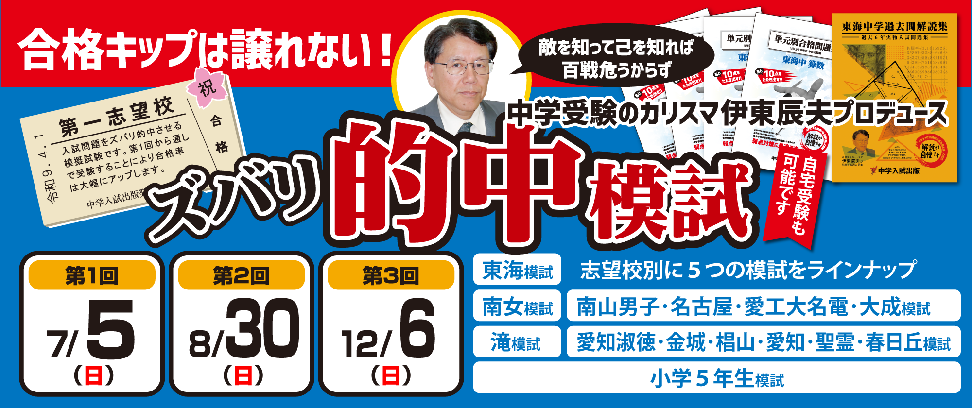 過去3年間の入試デ-タ-(配点・平均点・配点・合格最低点など)各ページに学校ごとの対策問題情報も掲載しております 大阪 高槻中学校 四天王寺中学校 大阪星光学院中学校 京都 同志社中学校 洛南高校附属中学校 洛星中学校 奈良 東大寺学園中学校 西大和学園中学校 兵庫 六甲中学校 灘中学校 甲陽学院中学校 神戸女学院中学校 関西学院中学部 愛知 南山中学校女子部 南山中学校男子部 名古屋中学校 愛知中学校 愛知工業大学名電中学校 愛知淑徳中学校 春日丘中学校 東海中学校 椙山女学園中学校 滝中学校 聖霊中学校 金城学院中学校 三重 高田中学校 鹿児島 ラ・サール中学校 愛媛 愛光中学校 単元別合格問題集 単元ごとに詳しく細かく対策ができます。第一志望の対策に向いてます。 年度別中学過去問解説集 各学校の過去問題集第2志望、第3志望の学校向けに対策していただくのに向いてます。 分野別合格問題集 苦手の克服全国難関中学と東海エリアの中学校の問題を網羅スキルアップに。 あとこれだけ合格問題集 苦手分野をレベルを少しずつ上げながら、対策克服できる問題集です。 最後の10点をこれで補ってください。 小学5年生向け 中部地区の中学入試5年の算数の受験問題集です。 入試予想問題 30年を超える過去問研究を通じて、東海・滝・南女及び中堅上位校の入試傾向を的確に分析し出題予想をしています。 入試直前模試5回完成 過去に実施された模試5回分の問題をセットにした愛知県中堅上位校向け入試直前用問題集です。 合格福袋 受験生に贈る厳選30題、入試予想家伊東辰夫先生のノウハウを凝縮した特別な算数の予想問題群です。 2026.3.27 インフォメーション 東海・滝・南山女子中 志望者向け【プラチナ合格パック】 2026.3.3 インフォメーション ホームページ現品限りのアウトレットセールのご案内 2026.2.4 インフォメーション 令和8年入試問題分析会は3月29日(日)開催! 2026.1.23 お知らせ 「2025予想問題:南女」に誤りがございました。 2026.1.16 お知らせ 「予想問題:愛知淑徳・金城・椙山・愛知・聖霊・春日丘 対象」に誤りがございました。 youtubeで内容の紹介をご覧いただけます